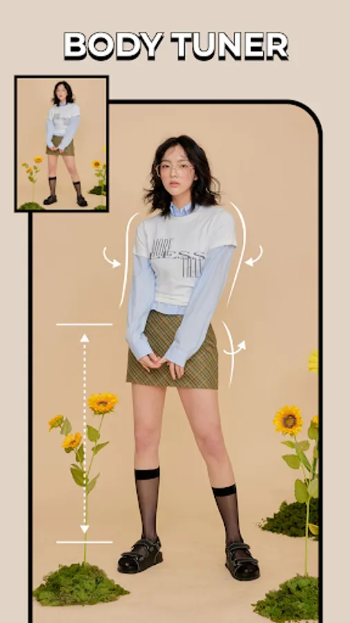 ♥ Body slimming: This feature allows users to adjust the size and shape of the body in the photo, creating a slim and attractive figure.