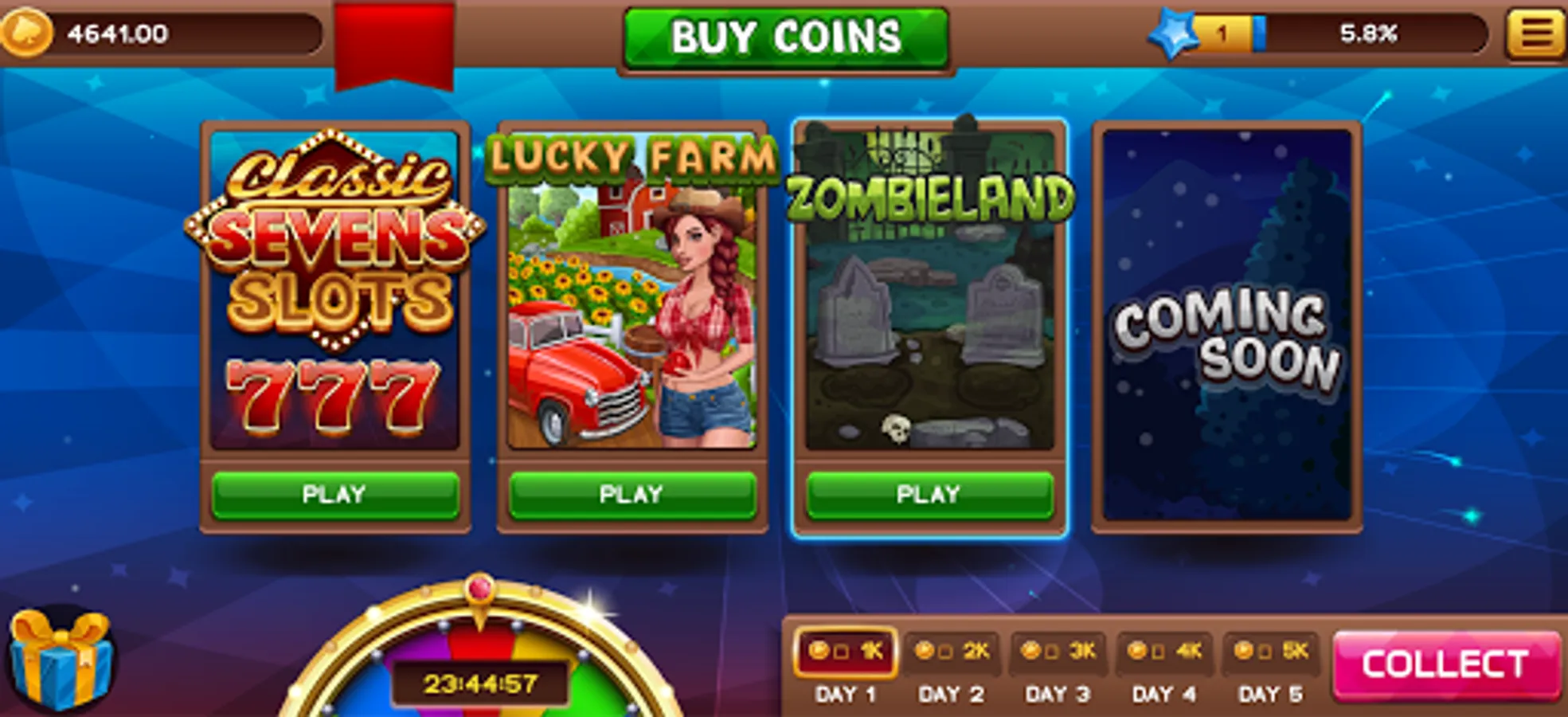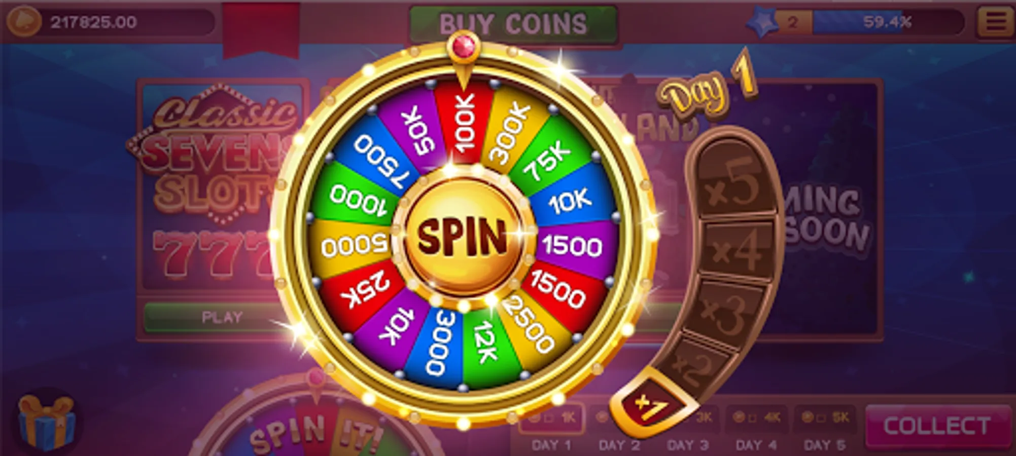 -Wheel of Fun: Spin the Wheel of fortune every day to multiply your Slots bonuses.