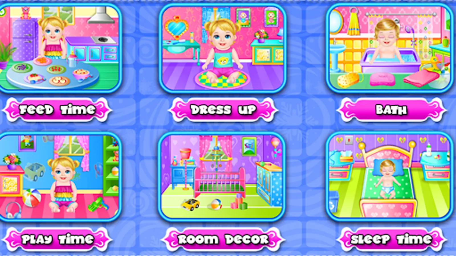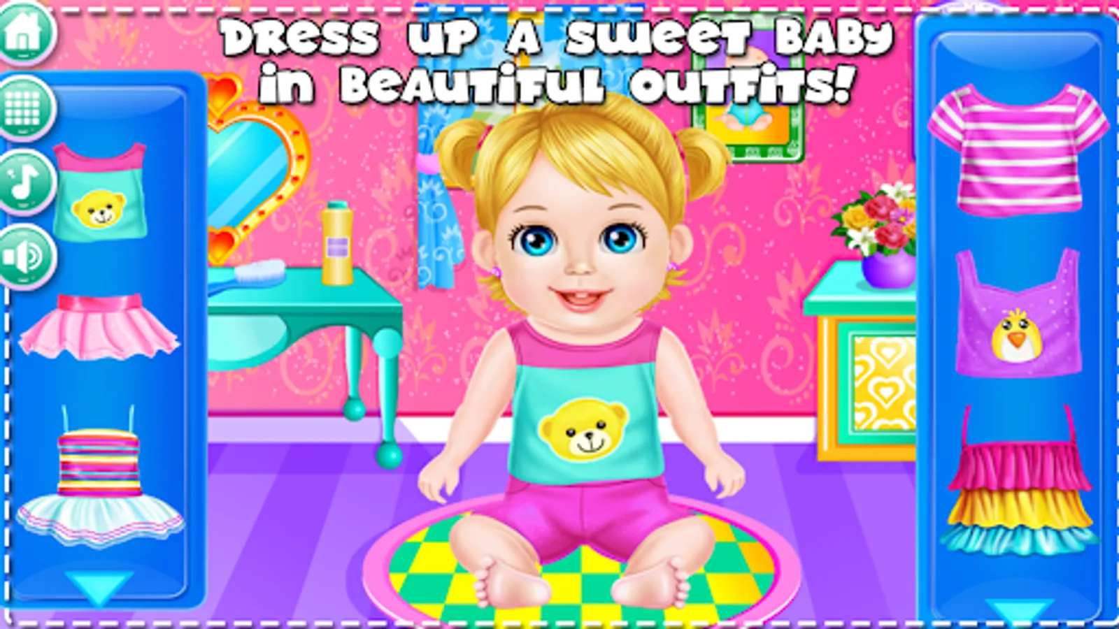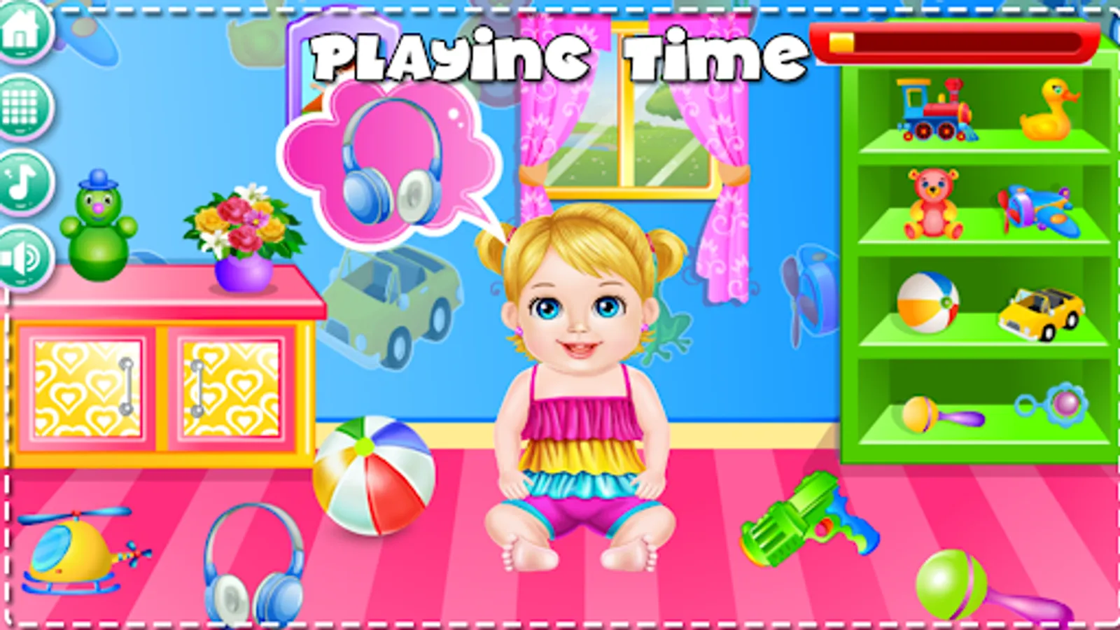Let's have fun popping soap bubbles.You can choose from a variety of cute outfits for baby. Combine colorful panties, Warm socks and comfortable shoes.Babies needs a delicious foods for several times a day. Prepare different types of foods like, fruits, boiled vegetables and milk.Play with your baby have lots of fun in the play pen! Play with the ball, plane, car, water gun, spin top and more to make your baby smile.Decorate sweet baby rooms with curtains, cradles, lamps, chairs, toys and walls.
