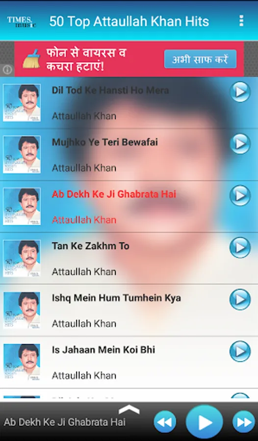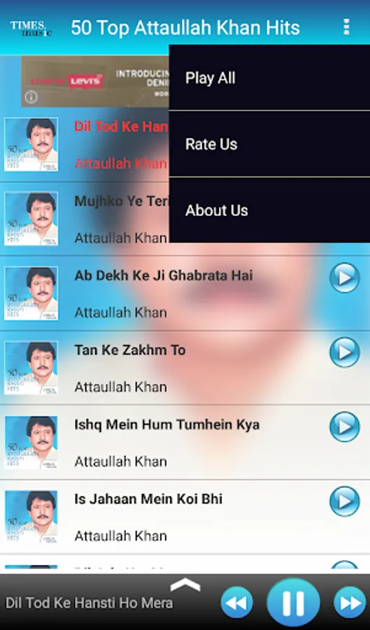 The app contains Attaullah Khan's top 50 Sufi Songs including Meri Barbadi Ka Ab Jashan, Bedardi Se Pyar Ka Sahara, Mera Dard Tum Na Samajh Sake, Mohabbat Ki Keemat, Dil Tod Ke Hansti Ho Mera, Tu Nahi To Teri Yaad Sahi, to name a few.