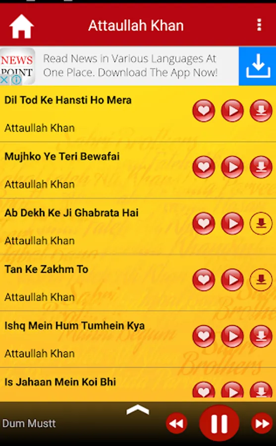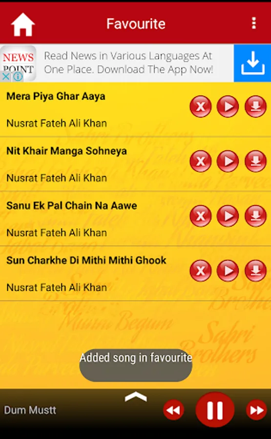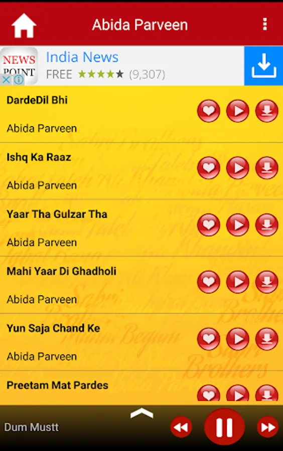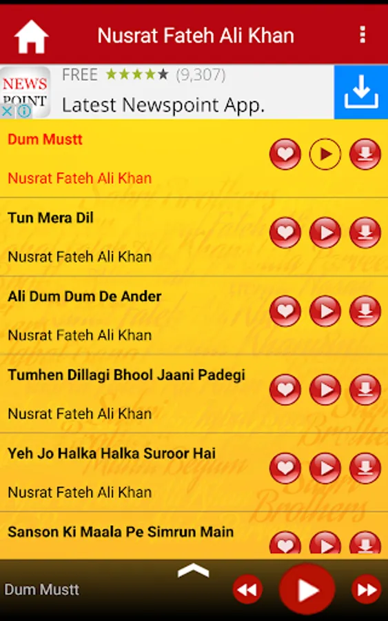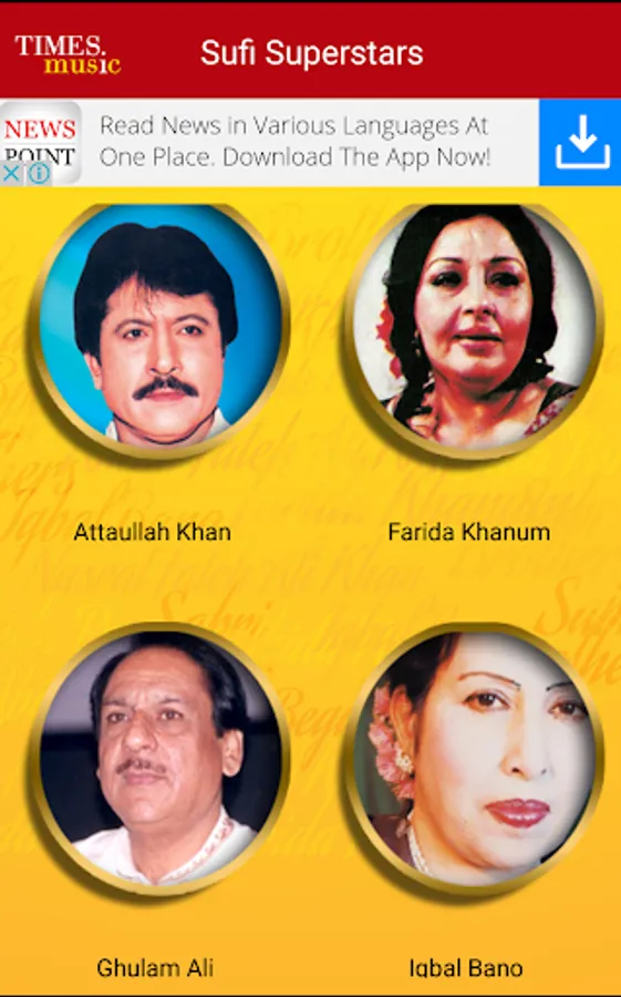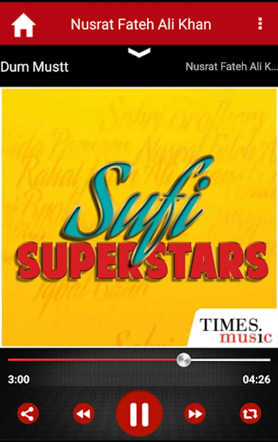 Download this free app and listen to the top Sufi songs by legendary Sufi artists including Nusrat Fateh Ali Khan, Rahat Fateh Ali Khan, Attaullah Khan, Ghulam Ali, Mehdi Hassan, Sabri Brothers, Abida Parveen, Farida Khanum, Iqbal Bano & Munni Begum.