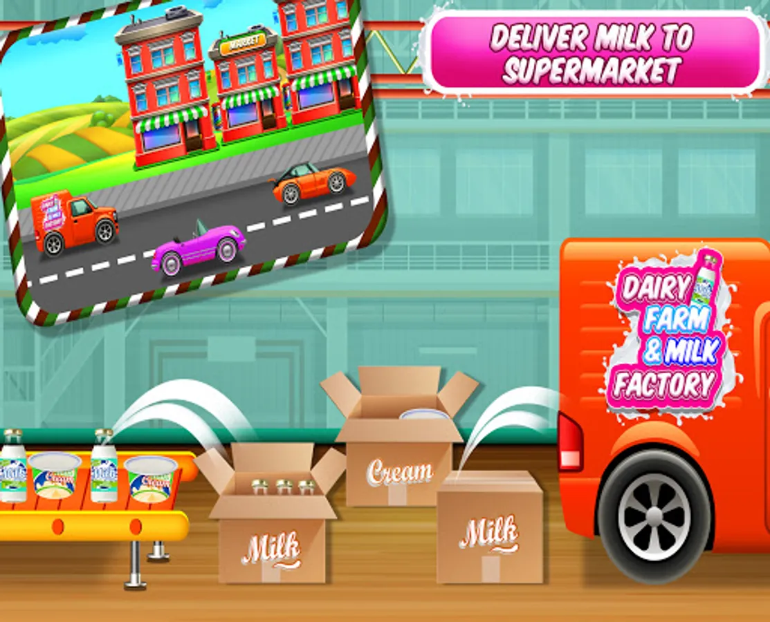Label cream and milk bottles with different name tags by processing through a milk factory machine. Pack the bottles into boxes, load them on the truck and deliver to the milk shops. Be the pro milkman with this milk delivery game. Dairy farm & milk factory games are full of learning and entertaining creative activities which will worth your time and will meet your farmhouse frenzy. Be a dairy farm manager and milk factory worker to get milk from cows, purify milk and extract cream from milk in the milk production factory game.
