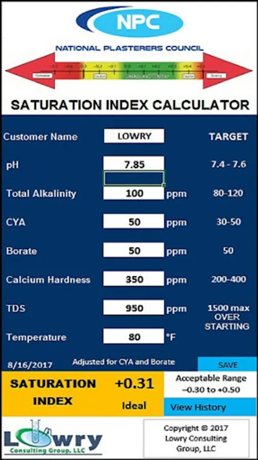 The NPC LSI Calc is the newest, most advanced and most accurate calculator for determining the Langelier Saturation Index (LSI) for swimming pool and spa water. It was developed by noted pool and spa water chemistry expert and author, Robert W. Lowry. It is the only LSI calculator that currently has exact adjustments for cyanuric acid and borate.