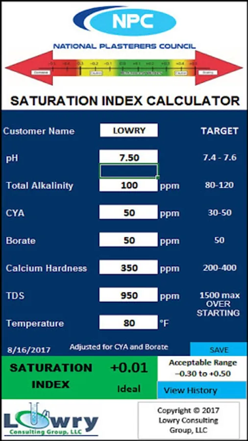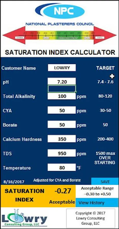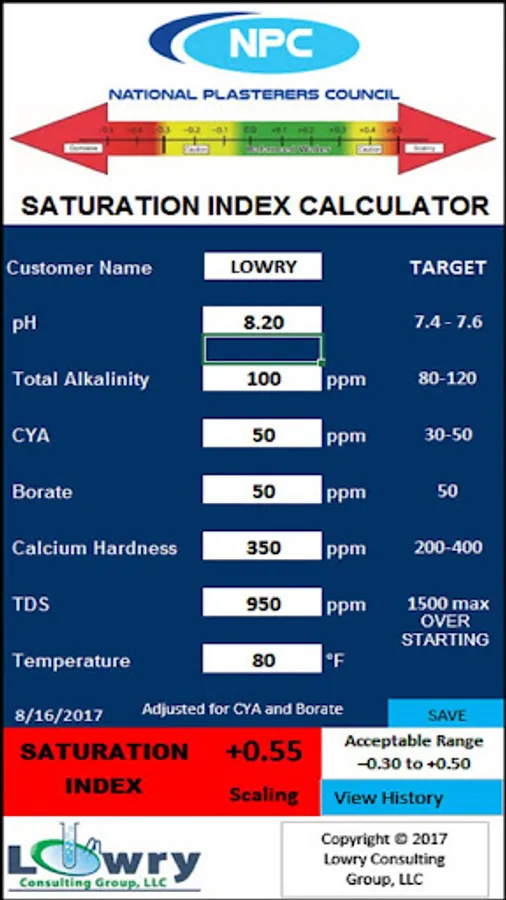 The NPC LSI Calc is easy to use, you input the customer or pool name and then the water test results for pH, Total Alkalinity (TA), Cyanuric Acid (CYA) Borate (B) Calcium Hardness (CH), Total Dissolved Solids (TDS), and the water Temperature (T) in degrees Fahrenheit. The LSI with adjustments is automatically calculated and displayed. The background color of the LSI value changes from green to amber to red depending on whether the water is Corrosive, Acceptable, Ideal, or Scaling. This gives a visual or at a glance notice of the water’s condition.