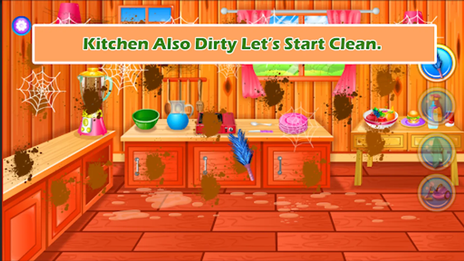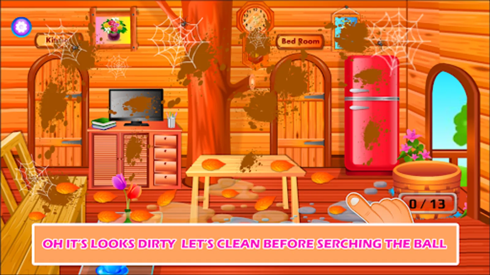 Inside the tree house, the living room was full of dust. So it has to be cleaned by using a duster, spraying water then wiping with a cloth and finally putting on the vacuum cleaner on the floor to remove the remaining dust. After the living room is cleaned the girl and pet are tired so they drink and eat some fruits. Since the ball is not found they go to the kitchen.