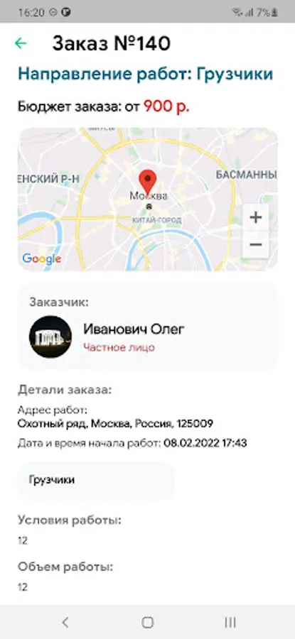 - Place an order for work with all criteria, place, number of people, etc.