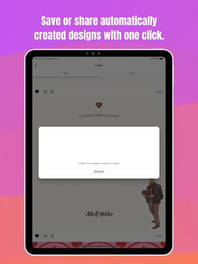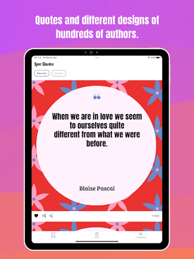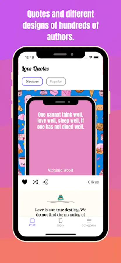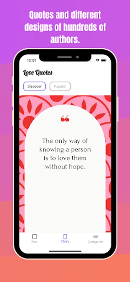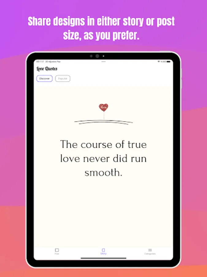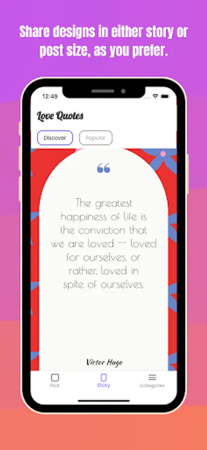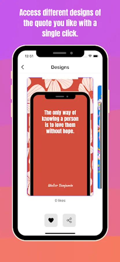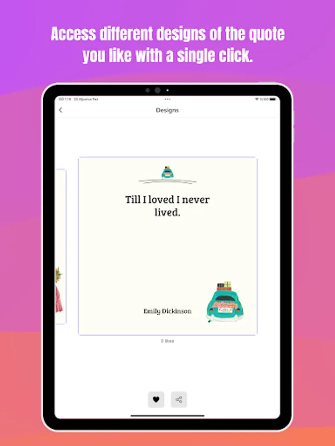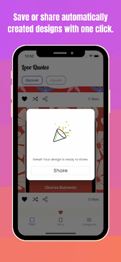 Discover hundreds of categories and thousands of quotes and designs from various authors. Choose from a variety of automatically generated designs for the same quote. Share your designs across all your social media accounts with a single click.