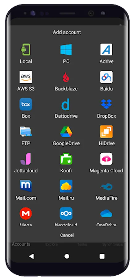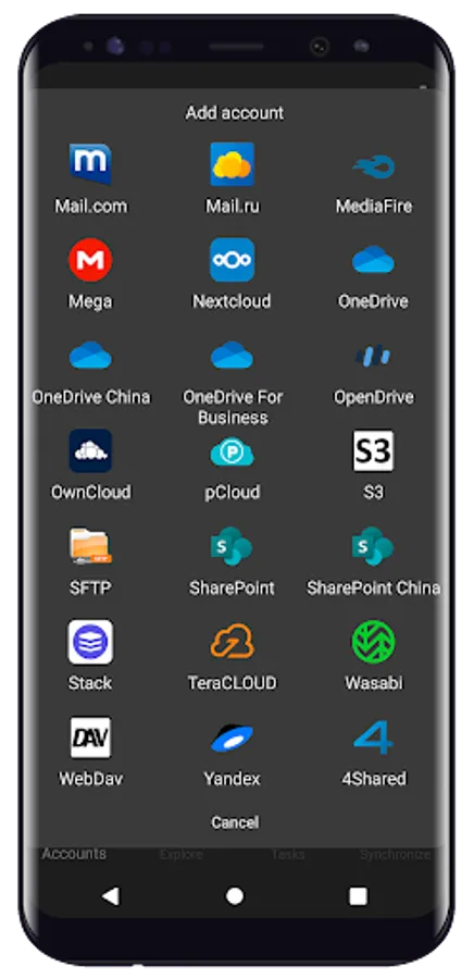 Air Explorer for Android is intended for accessing multiple cloud accounts from a single applicaction. In this regard, the tool supports connecting to various online storage services, such as Google Drive, OneDrive, Dropbox, Mega, Box, Mediafire, Yandex and more. Moreover, it is compatible with S3, WebDav, FTP and SFTP, which means you can connect to many other servers based on these protocols.
