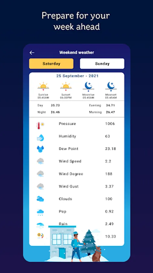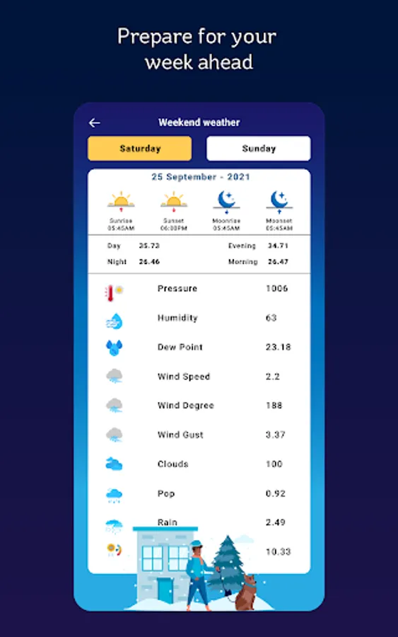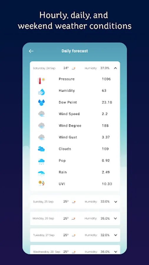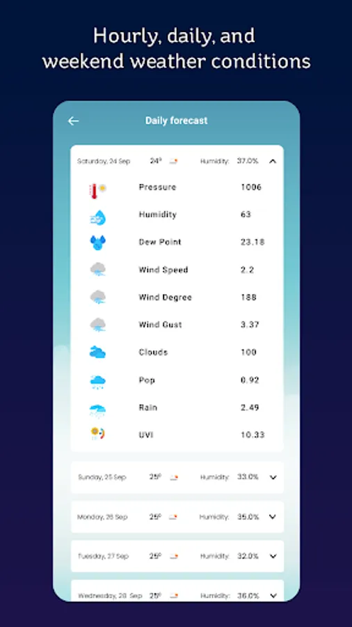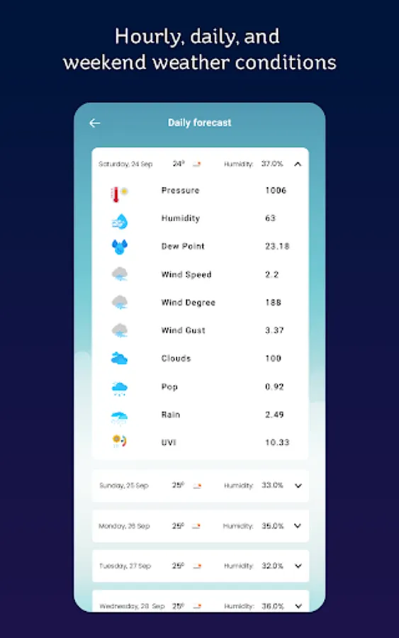 App provides 24h weather forecast, in each hourly section we have: Humidity, rain probability, precipitation, wind chill, dew point, cloud cover, UV index, pollen index, pressure, sunrise, sunset, moon phases, wind speed, ozone level, wind direction etc.