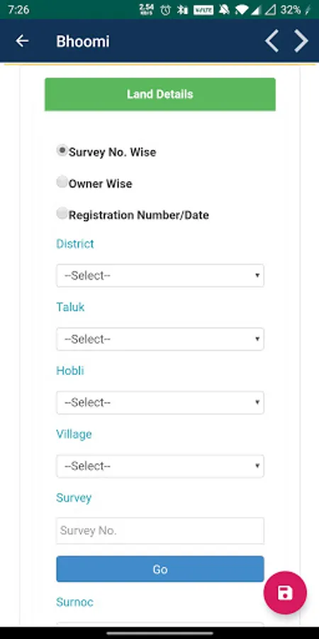 1) User can get details via survey no wise, owner wise or registration no. Select the option as per your choice.