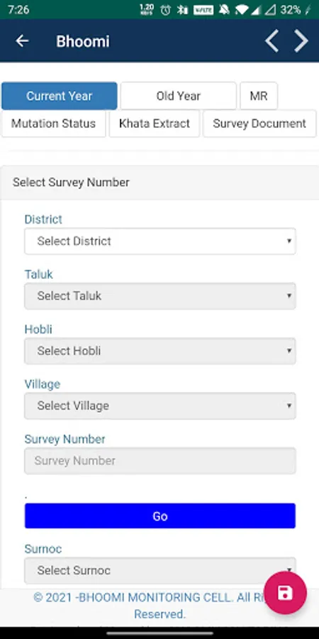 2) Select district, taluk, hobli, village, survey no, surnoc and hissa