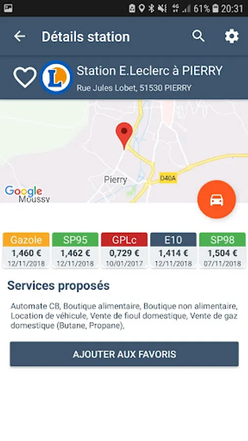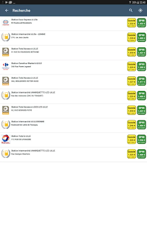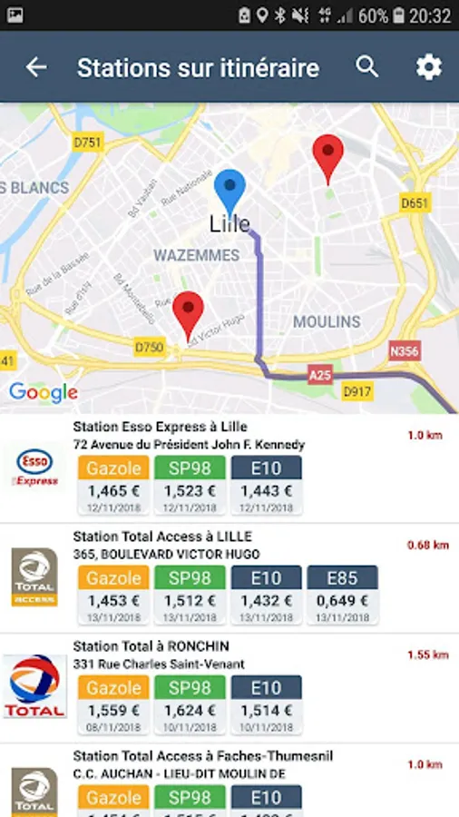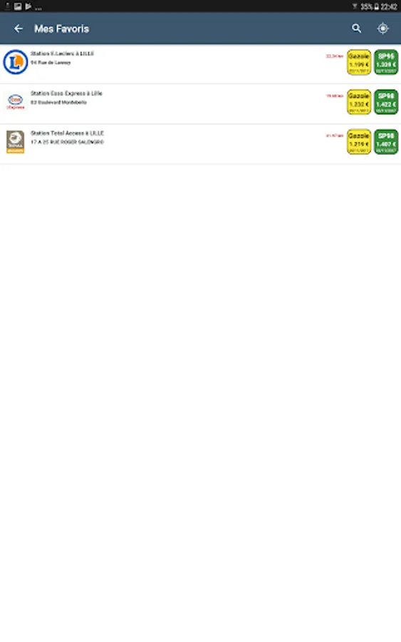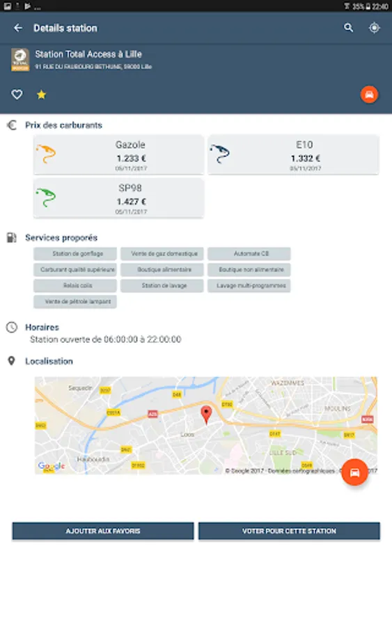 - For each station there is a descriptive sheet indicating the price of the stations and services offered, as well as the possibility of launching navigation towards this route