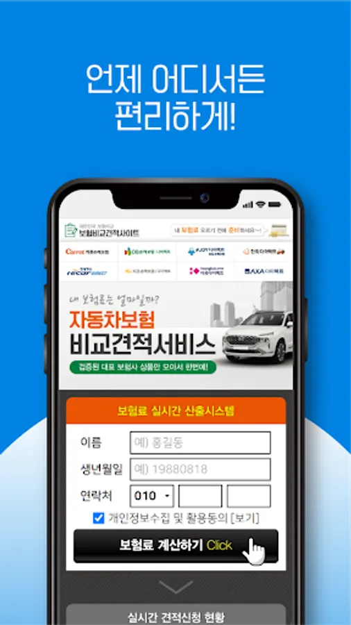 There are many people who do not know which insurance company to choose from among various insurance companies such as Samsung Fire Direct Auto Insurance, Hyundai Marine Direct Auto Insurance, Dongbu Fire Direct Auto Insurance, Meritz Direct Auto Insurance, and Kyobo AXA Direct Auto Insurance. Being famous is not an auto insurance that suits you, so you need to make a careful decision. In this application, we will do our best to help you choose the most reasonable insurance for the insured.