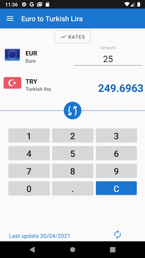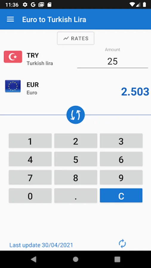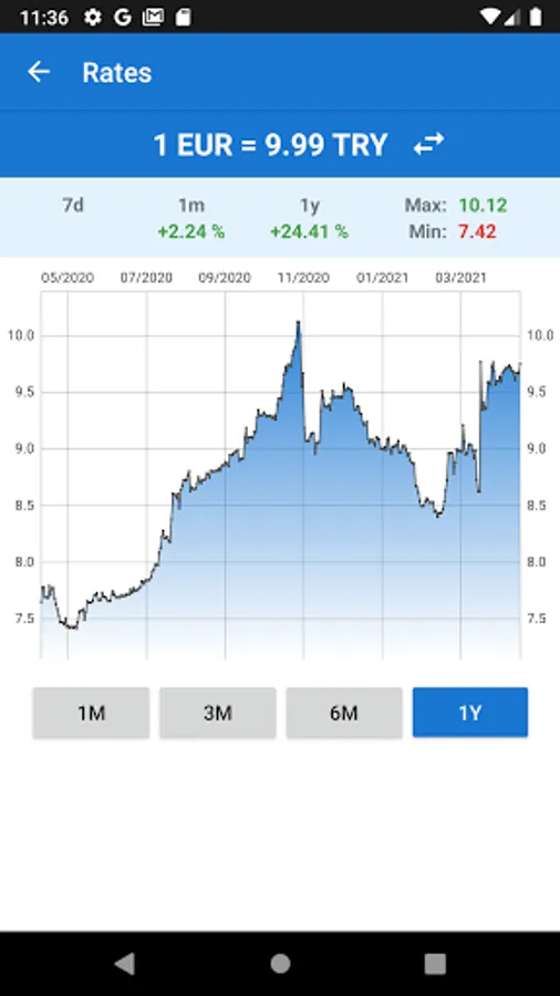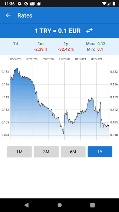 This application also allow you to see the chart with the historical exchange rates between Euro and Turkish Lira. Rates variations from the last week and months will be displayed and the highest and lowest rates.