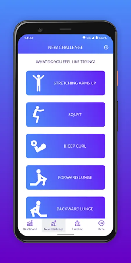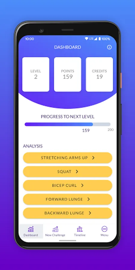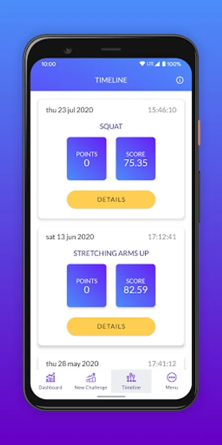 In the showcase version of the App you can practice five routines from simple arm stretch, through squats, bicep curls and forward and backward lunges. Scores are based on measurement of key aspects of each routine as determined by coaching experts. These measurements are converted to scores which allow for different levels of experience and ability as well as age and gender.
