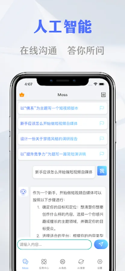 Moss is an artificial intelligence assistant application that integrates core functions such as chat question and answer, creative creation, copywriting, character AI and intelligent search engine, providing you with a full range of intelligent support.