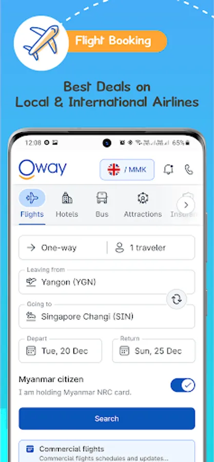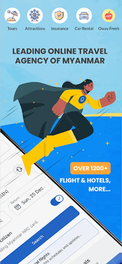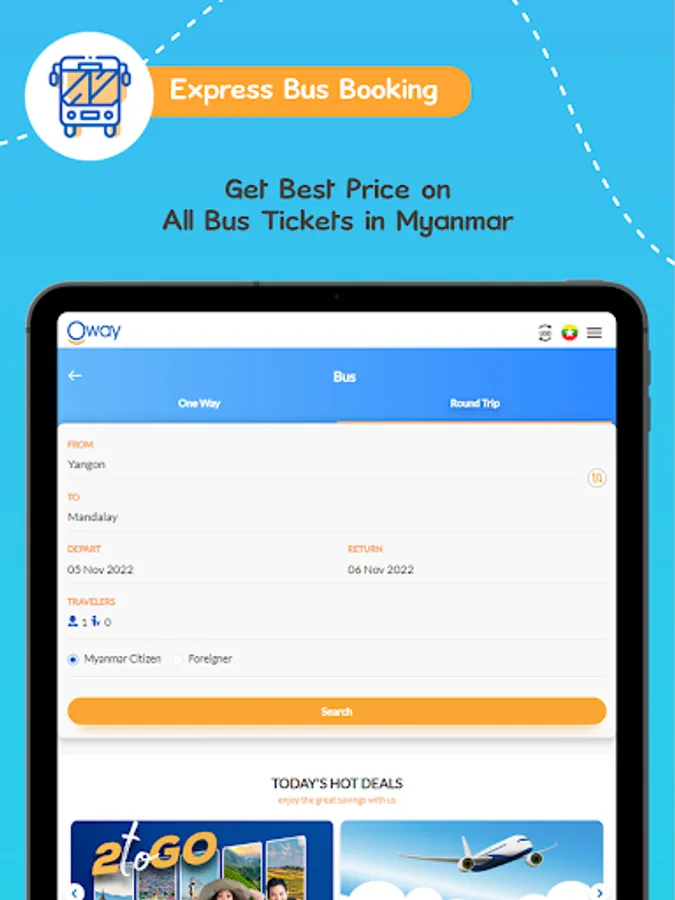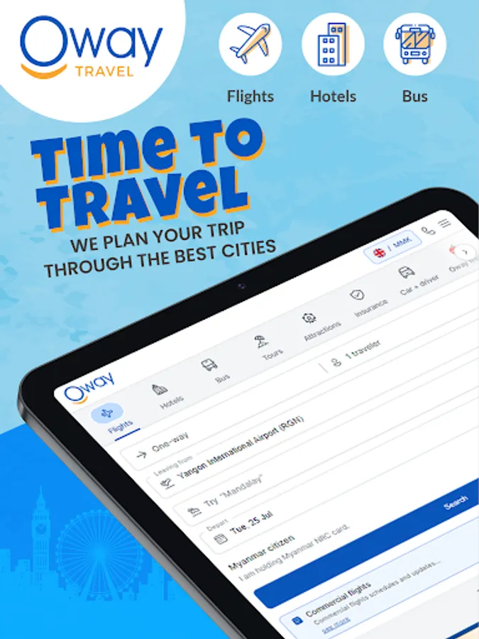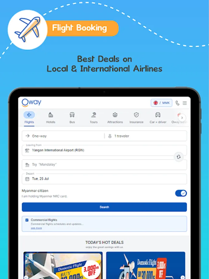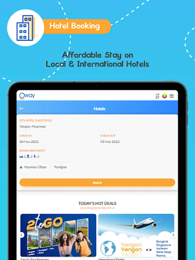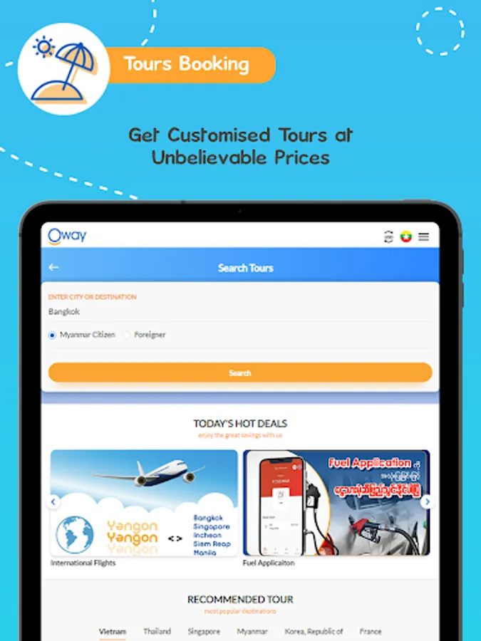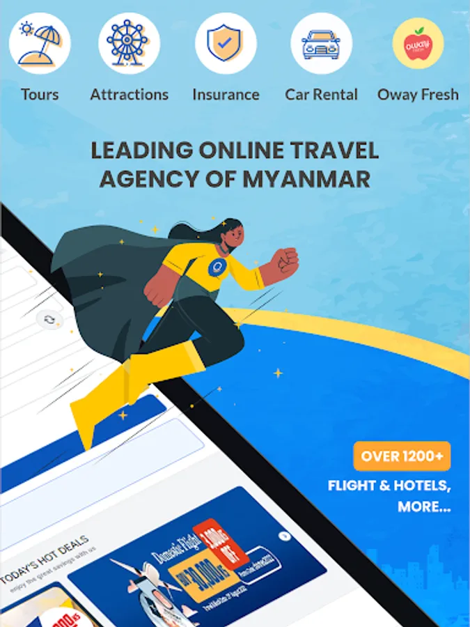 Explore the World with Oway! Plan your dream trip to Myanmar and around the world with Oway’s free travel application. Save on domestic and international airfares, hotels and tour packages. Focusing on both Myanmar and International travellers, Oway’s application is available in Myanmar and English languages and accepts both US Dollars and Myanmar Kyats.