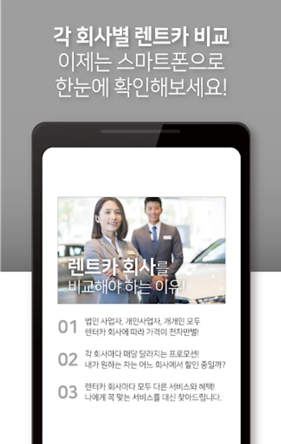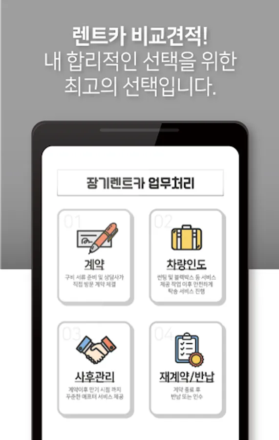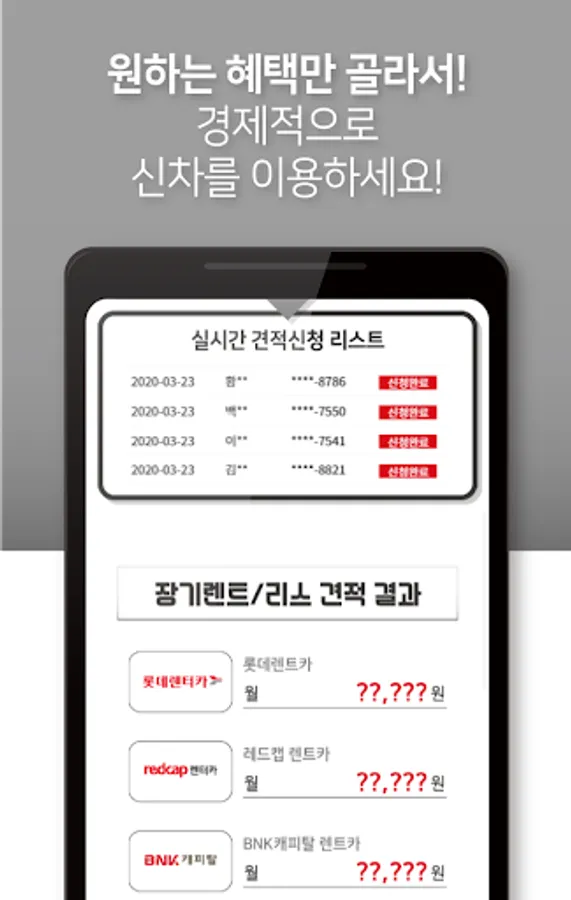 As an advantage of the application, you can find out all about long-term rental cars such as long-term rental car fare table, prepayment, etc. of all rental / lease companies in Korea.