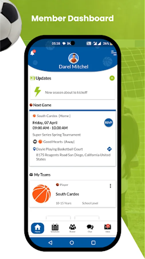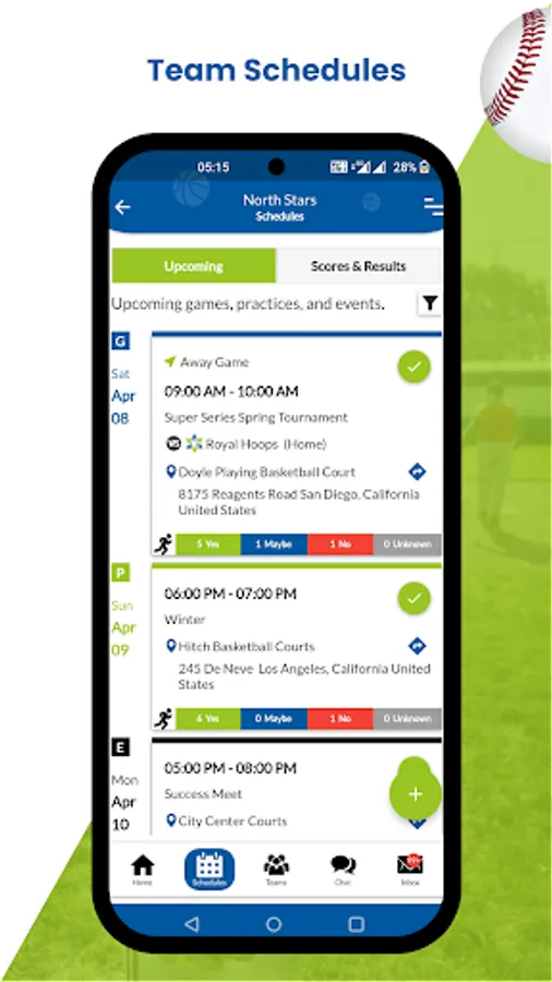 Schedules, RSVP: Access team schedules and update the game, practice, or event availability.