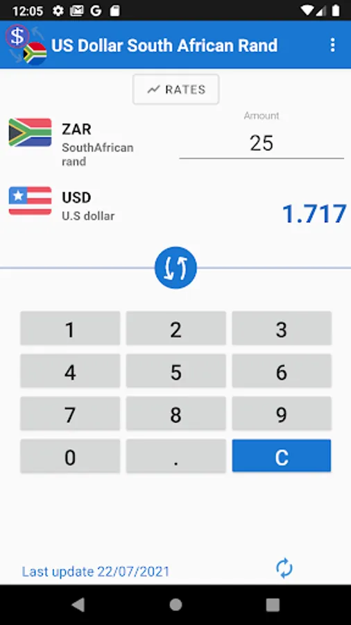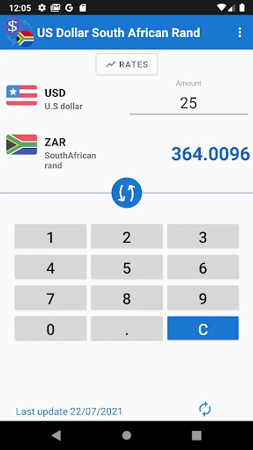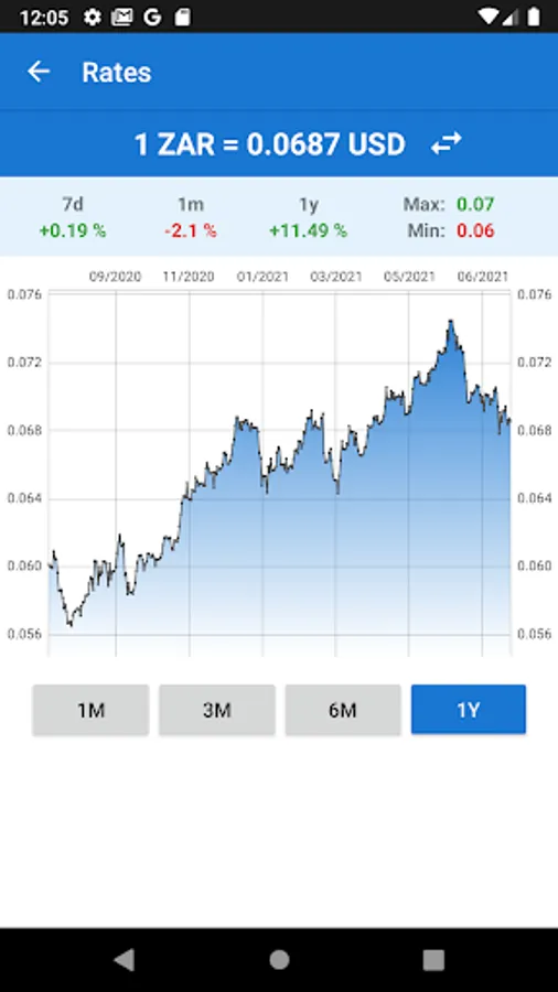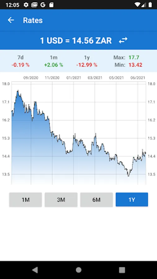 This application also allow you to see the chart with the historical exchange rates between US Dollar and South African Rand . Rates variations from the last week and months will be displayed and the highest and lowest rates.