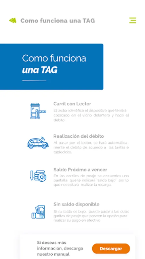 This APP facilitates the recharging, creation and management of accounts for VAS MÁS Prepaid (VAS+) users, a VAS highway payment option that allows faster passage through toll booths, offers special rates and a benefit plan for users frequent.