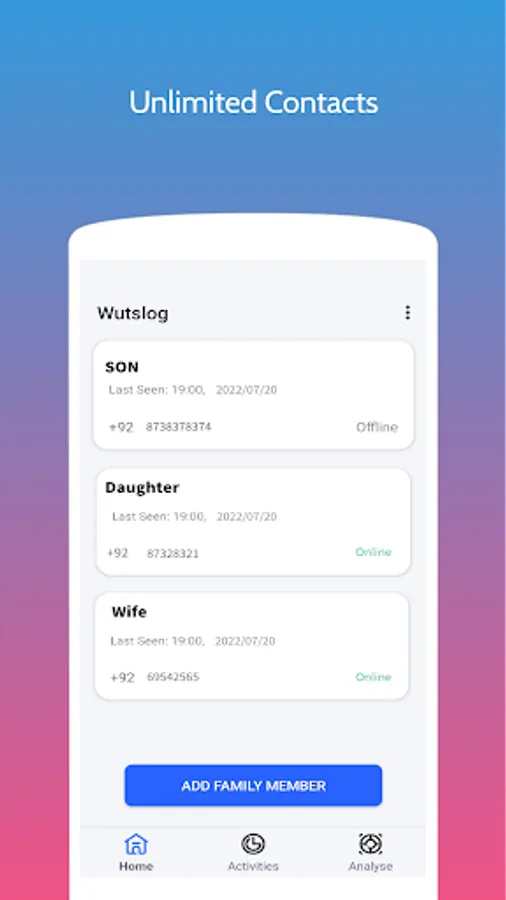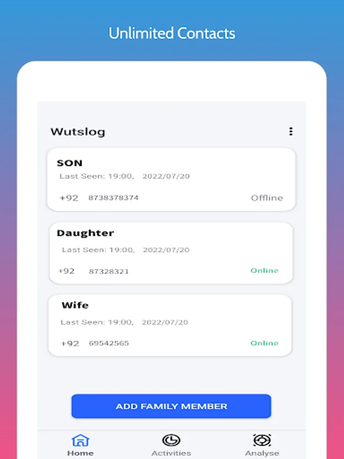 Wutslog : Last Seen is designed to check the online activities of your family members. Securely add your family members and start analysis.