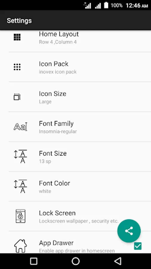• Hide apps from the drawer, customized font selection (font-face and size).