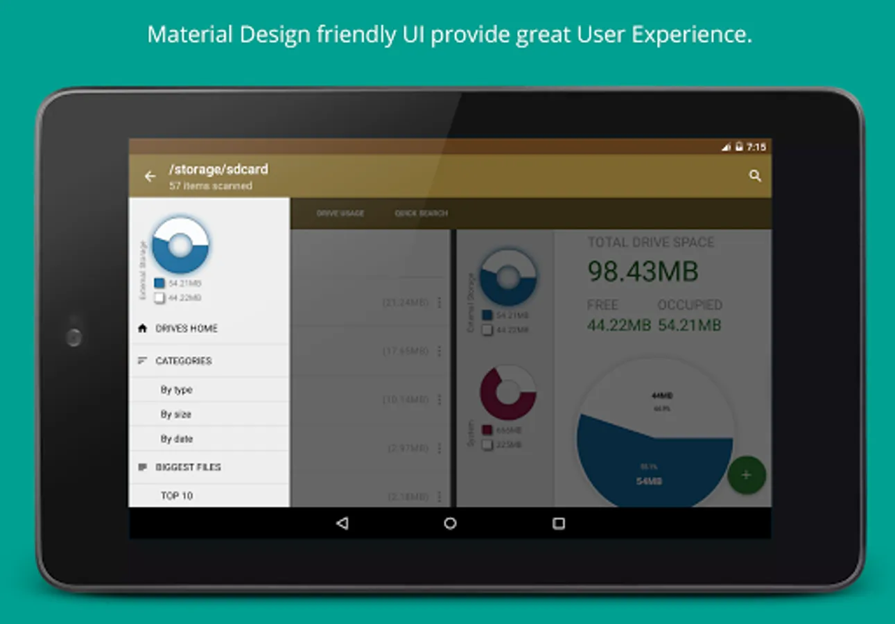 Storage Analyzer & Disk Usage displays information on sdcard, usb devices, external and internal storage in a simple and clear graphical form (infographics).