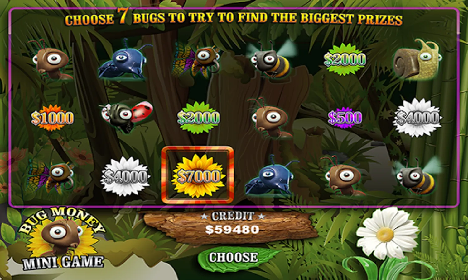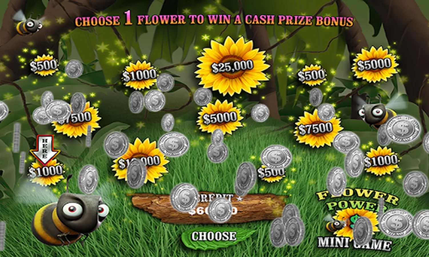 With unlimited free coins and bonuses, try to win as much money as possible by also playing features such as the Big Sun Flower Wheel of Fortune bonus feature plus the Bug Money and Flower Power mini-games to accumulate virtual credit prize bonuses.