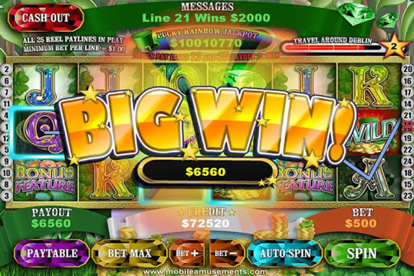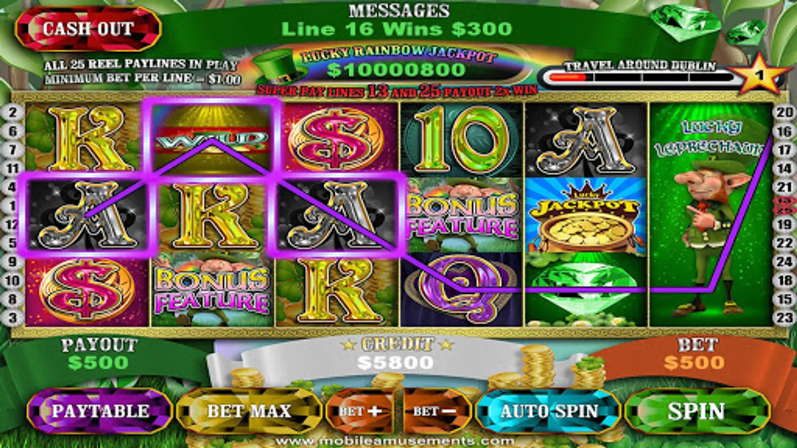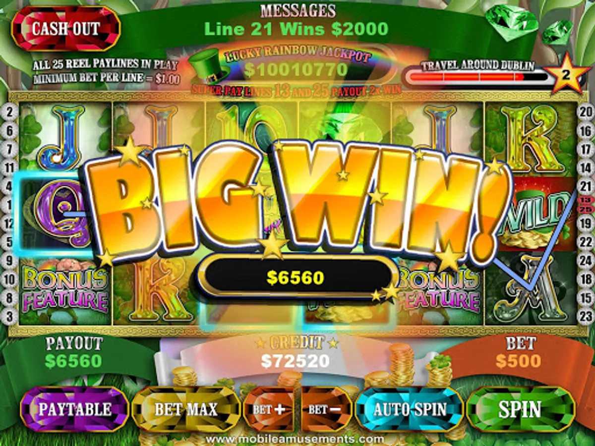 With unlimited free coins and bonuses, try to win as many riches as possible by also playing features such as the Leprechaun's Rainbow Wheel of Fortune bonus feature plus the Triple 7 and Lucky Money mini-games to accumulate virtual credit prize bonuses.