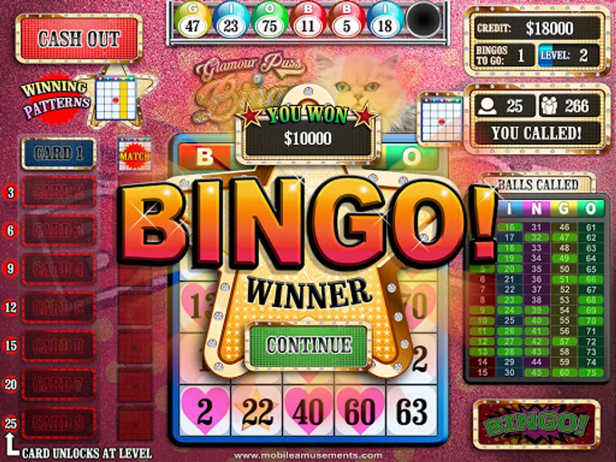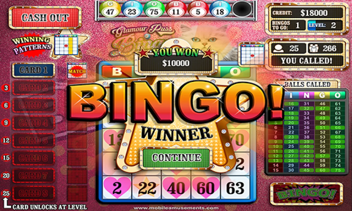 Glamour Puss Bingo the kitty cat themed Bingo game from Mobile Amusements where you can win a virtual cash fortune!