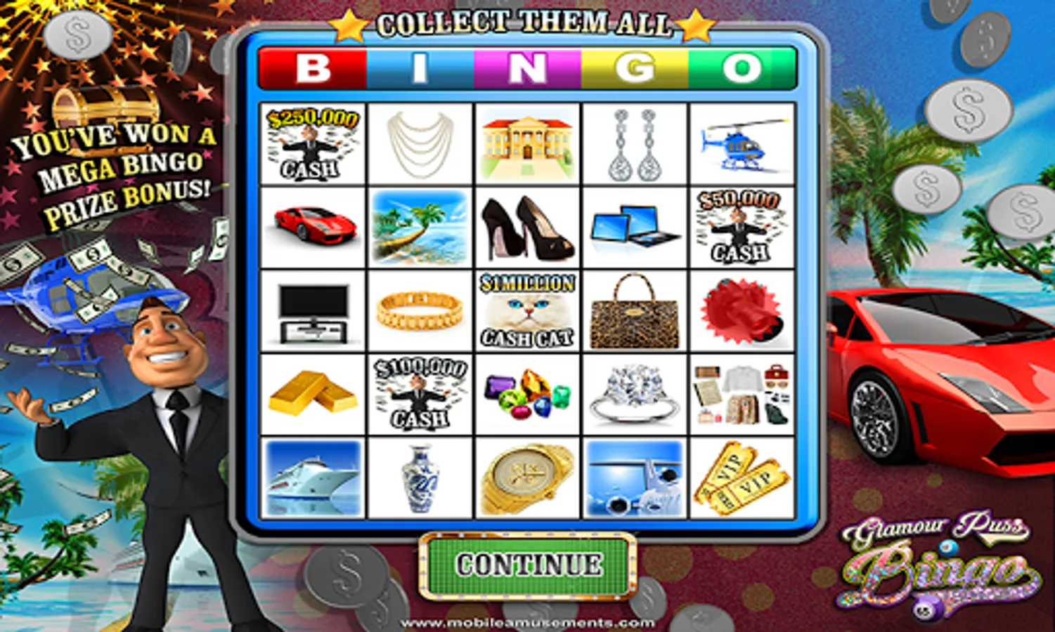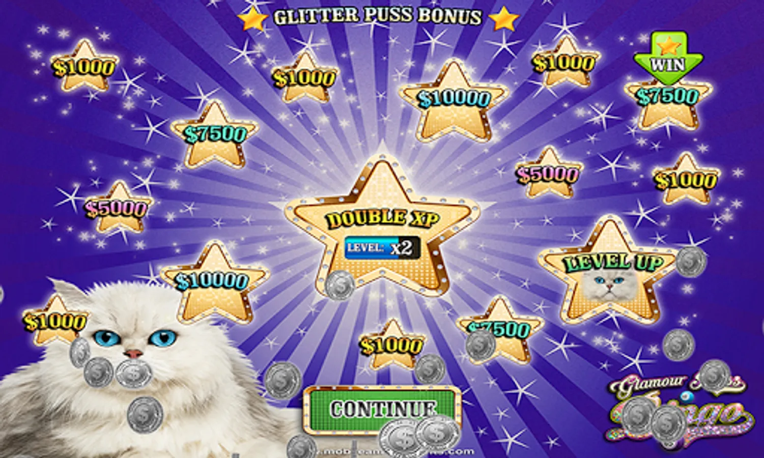With unlimited free coins and bonuses, try to win as much moggy money as possible by also playing features such as the Glitter Puss Star Bonus and Mega Bingo Prize Bonus mini-games to accumulate virtual credit prizes.