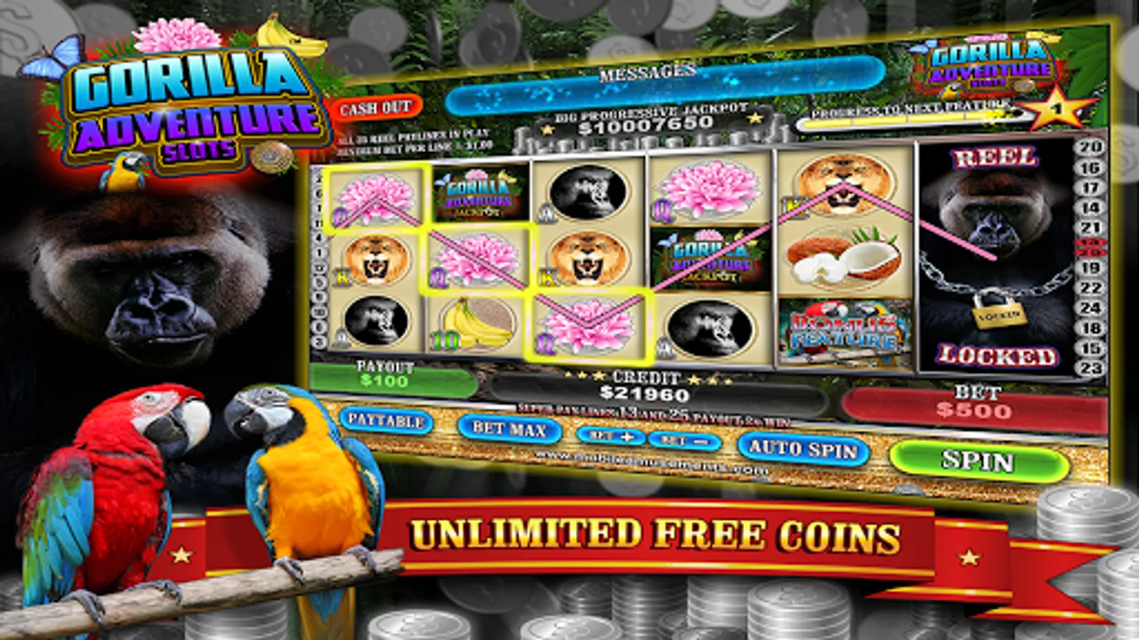 With unlimited free coins and the biggest jackpots, try to win as much cash as possible by also playing features such as the Lucky Gorilla Bonus, Jungle Prize Bonus and Monkey Cash Prize Bonus mini-games to accumulate virtual credit prizes.