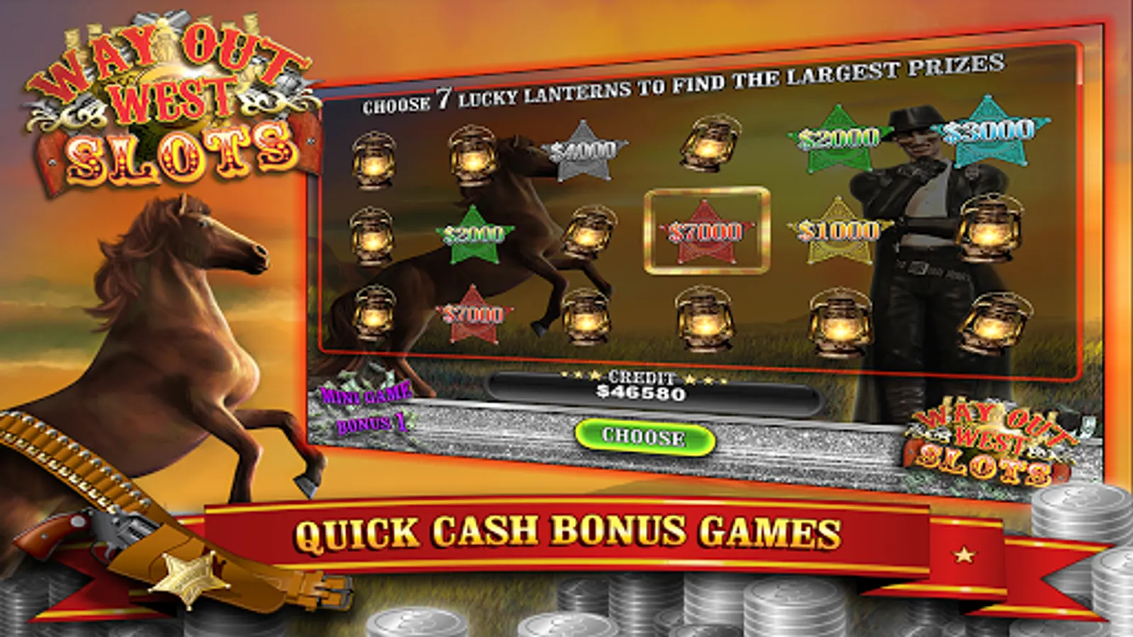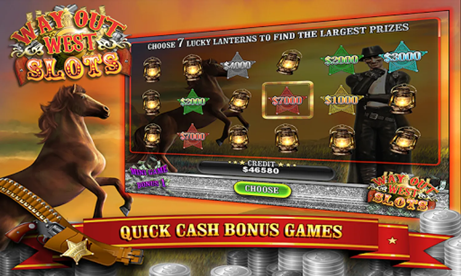 With unlimited free coins and the biggest jackpots, try to win as much cash as possible by also playing features such as the Saloon Bonus Feature, Lucky Lanterns and Quick Shootin Cowgirl Cash Prize Bonus mini-games to accumulate virtual credit prizes.