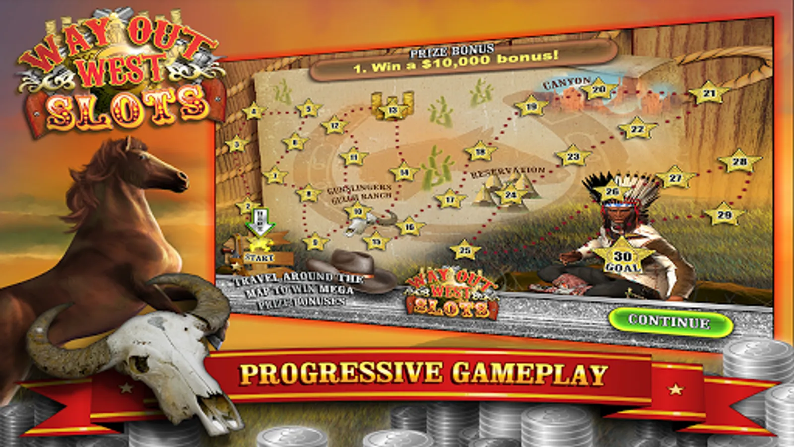 As you ride through many progressive levels from Gunslingers Gulch Ranch, through the Canyon and finally to the Indian Reservation for the big cash showdown with Chief Running Bull, you'll be able to place Huge Max bets progressing up to $5000 and unlock even more fantastic prize bonuses and new features on the way.