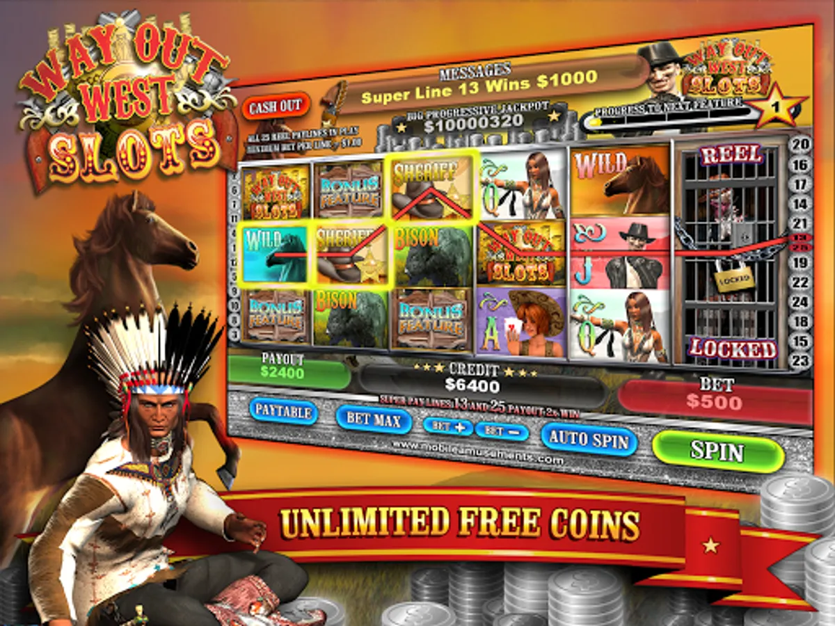 Including extra features such as Free Spin Bison, $10000 Sheriff Star Cash Bonus, 2x Payout Reels feature, Lucky Line, Super Lines, Multi-Free Spins and Huge cash payouts.