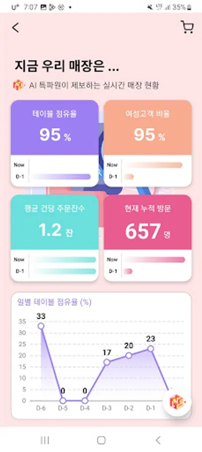 - Table occupancy, average number of orders per order, and main customer behavior patterns show data from 10 minutes ago, and customer ratio from 1 hour ago.