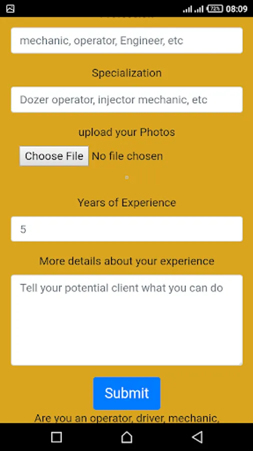 Professionals and artisans can identify each other on this platform, we expect Engineers (mechanical, civil, electrical, mining e.tc), mechanics, injector mechanics, etc are all expected on this platform and can upload a brief description of themselves and experience for a potential client to see