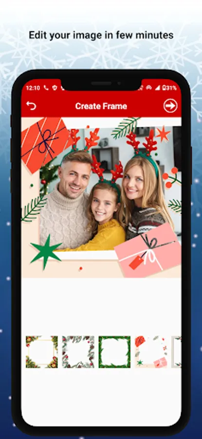 Increase Christmas spirit with photo frame effects such as Santa Clause and reindeer, Ice castle, Snowman and many others.