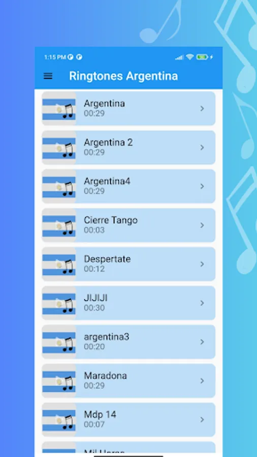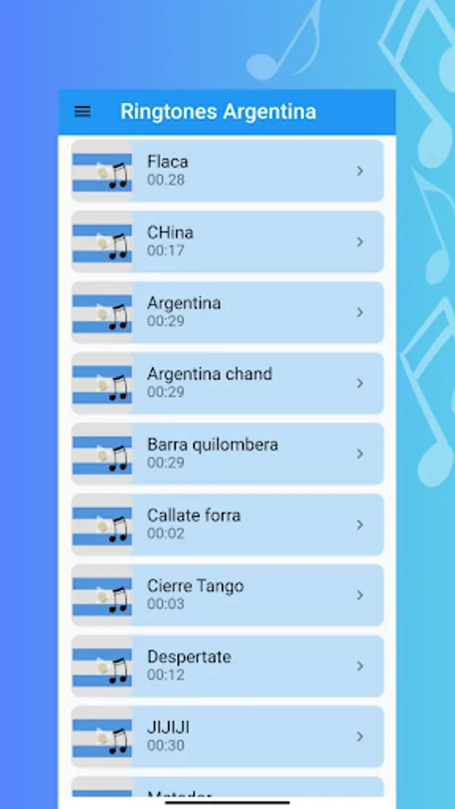 Music of Argentina with melodies to put as alarm tones, notifications, and SMS, for calls for all Android and Tablet mobile devices to place as Argentine music ringtones, a large collection of Argentine songs, from fans the best option to choose as Argentine ringtones, notification tones and what about waking up every morning with personalized alarms with the instrumental rhythm, soft, harmonious, fun, romantic, love, soccer tones, classic music free Argentina songs with an excellent sound , It has a mix of melodies and sounds and ringtones of different calls created by the Argentines to get attention when your cell phone rings, select the South America ringtone and play the one you want.