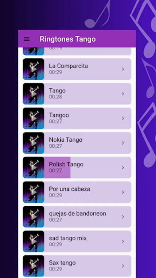 Enjoy the free tango music ringtones, the best ringtone of tropical tangos 2019 to download online, the list of songs is constantly updated with the new romantic tango music to download the tones on the phone for free, they are classified among the most new, classic, popular, original the most listened to, select the ringtone, alarm tones, SMS tone that you like most, I know you will love the new application of ringtones and sound effects of the rhythm of the tango melodies and the milonga, piano sounds, violin, bandoneon, viola, varied romantic flute mp3 the melody most struck by all lovers of this great musical genre, Ringtones with excellent sound and mp3 format, to play and set as ringtones , alarms, notifications, and text messages, harmonious tones.