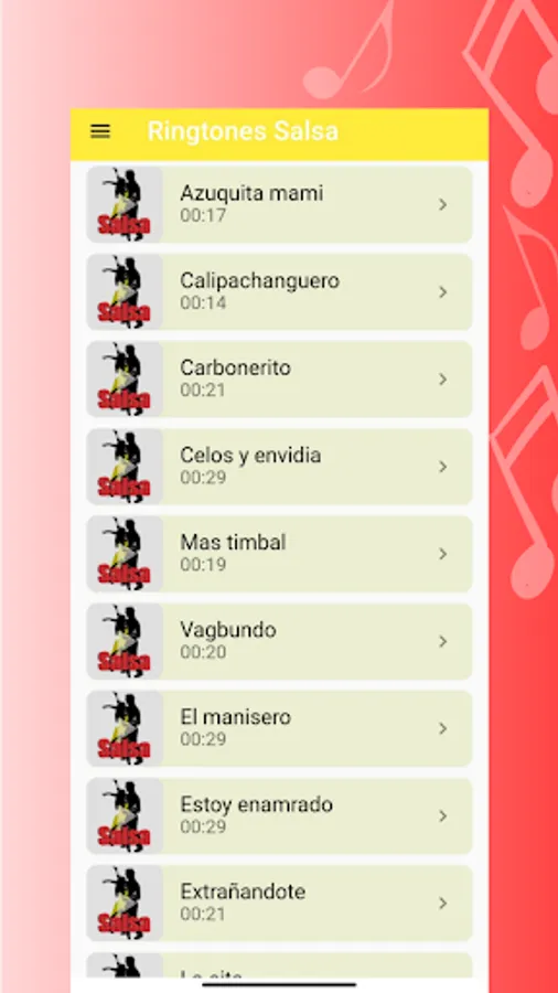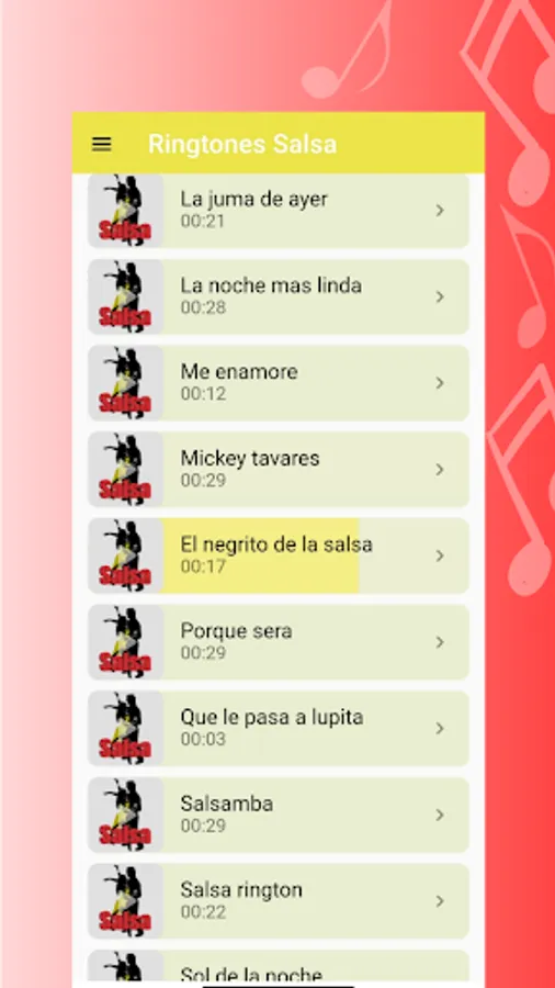 Salsa for all Android and Tablet mobile devices to place as tropical music ringtones, a large collection of salsa songs as a tone, the best option to choose as ringtones, notification tones and how about waking up every morning with personalized alarms With the rhythm of dance, moved, slow, fun, romantic, love, strong, soft, classics with a rhythm similar to merengue, mambo, tropical, it has a mixture of different melodies and sounds, salsa brava and salsa romantica.