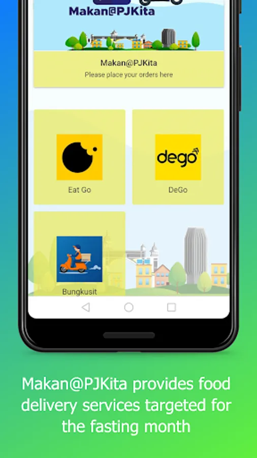 Makan@PJKita provides food delivery services targeted for the fasting month. Customers may select their preferred e-hailing services (Bungkusit, Go Eat, Dego) and then select their orders. Payment is through e-wallet such as Maybank, Boost and Touch & Go.