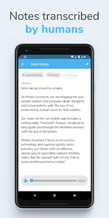 Mobile Assistant utilizes professional, U.S.-based, human transcriptionists, trained to accurately type your notes. This is NOT voice-recognition software.