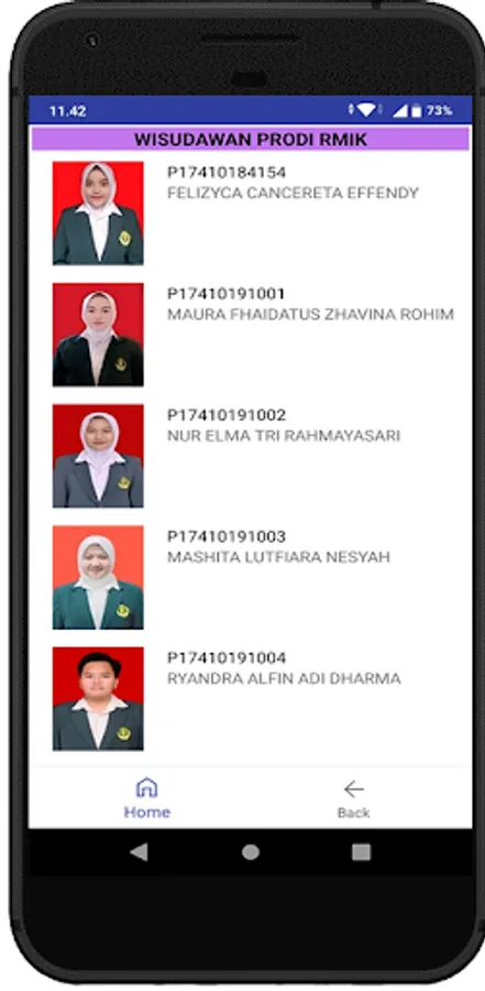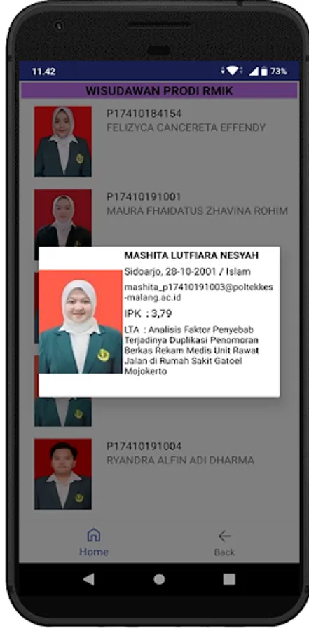 This android-based application contains a list of names of graduates (graduates) of the Health Polytechnic of the Ministry of Health of Malang based on each department / study program. This application displays, among others, NIM, Name, TTL, GPA and Thesis Title