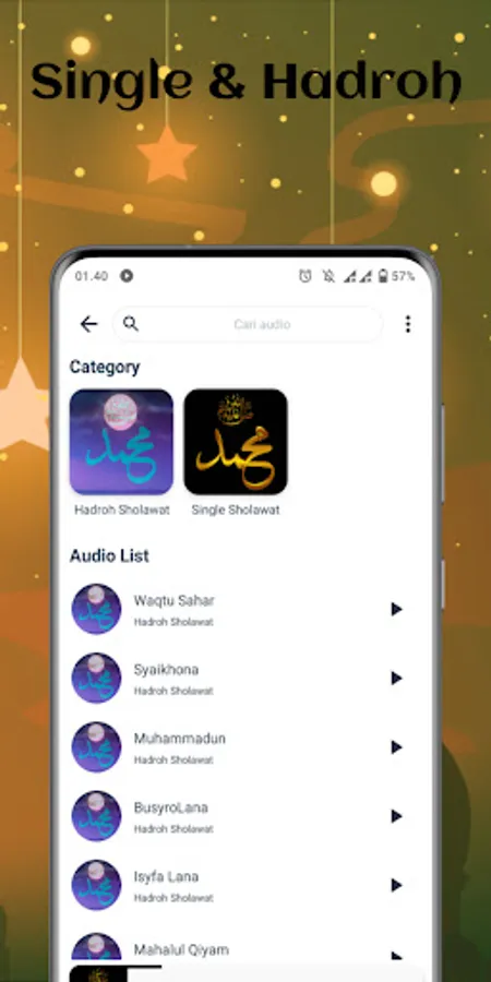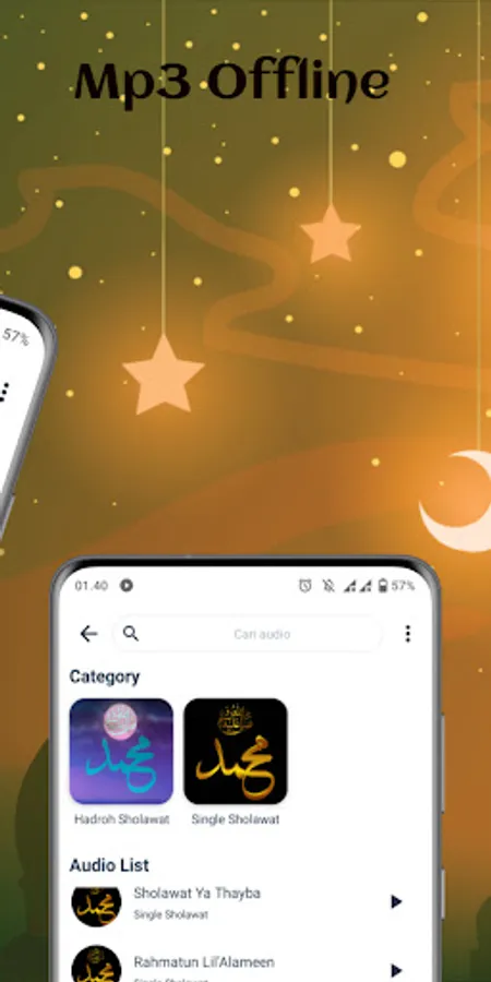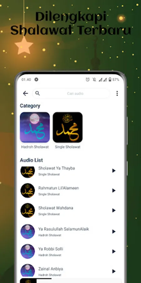 The Offline Prophet Sholawat Mp3 Application Contains the Best Collection of Sholawat of All Time with 2 playlists, namely Single Sholawat and Hadroh Sholawat which are popular in Indonesia.
