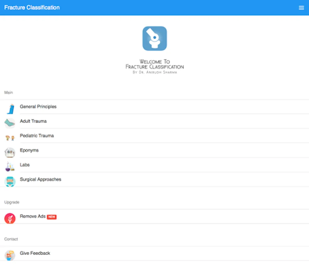 Fracture Classification App is the number one pocket reference tool for quick and easy way to access the various classification systems present in traumatology today. This app offers something very simple, yet invaluable to both residents and physicians alike. The up-to-date content of this app together with a robust feedback system and the ability to evolve makes it everyone's favorite. The best part is the offline* availability of the content whenever you need it on the go. Boasting an intuitive design and fast UI, this is the app you can count on working when you need it the most. Best of all, the app is updated with the latest guidelines in orthopedics.