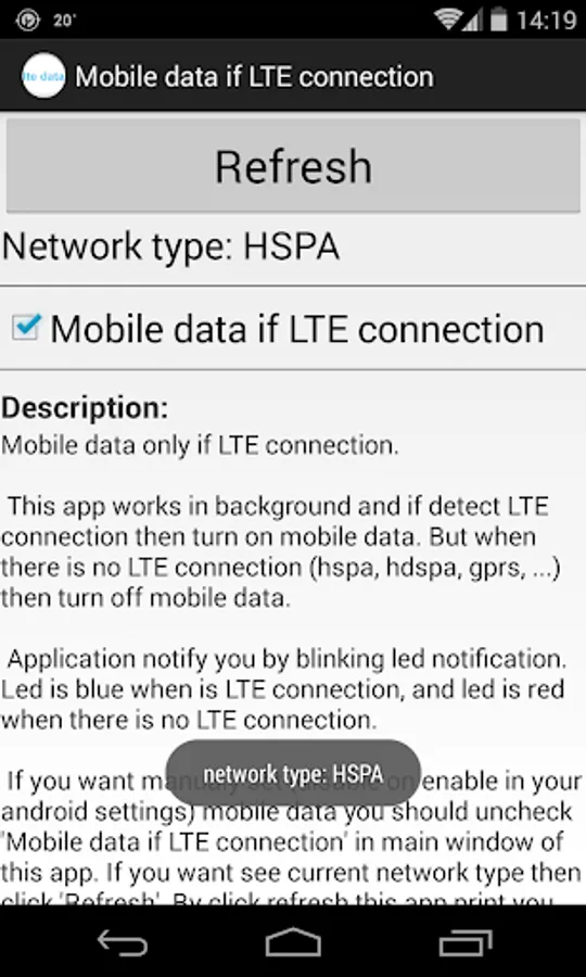 If you want manualy set (disable on enable in your android settings) mobile data you should uncheck 'Mobile data if LTE connection' in main window of this app. If you want see current network type then click Refresh