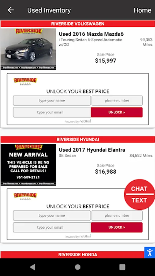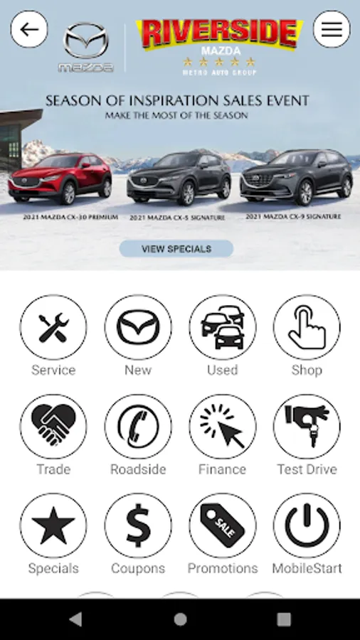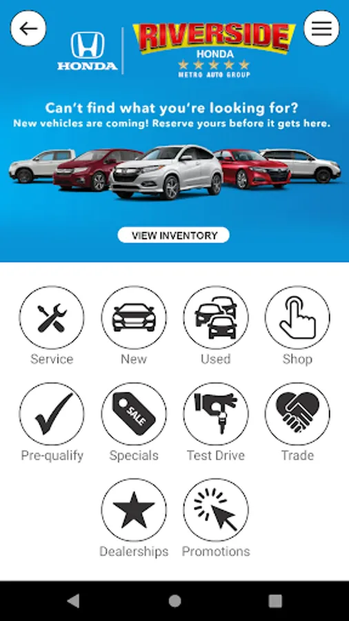 Riverside Metro Auto Group dealership loyalty app provides customers with an enhanced user experience, including personalized coupons, specials and easy service scheduling. Our brands include: Honda, Hyundai, Nissan, Mazda, VW.