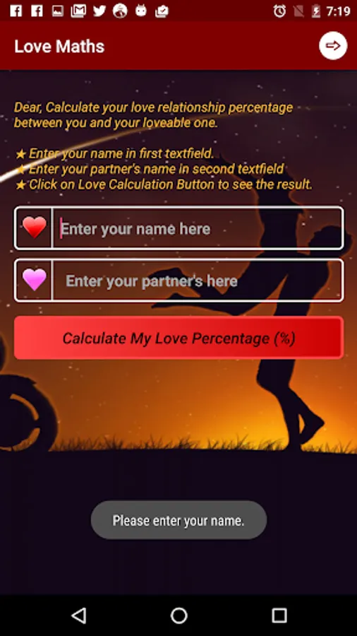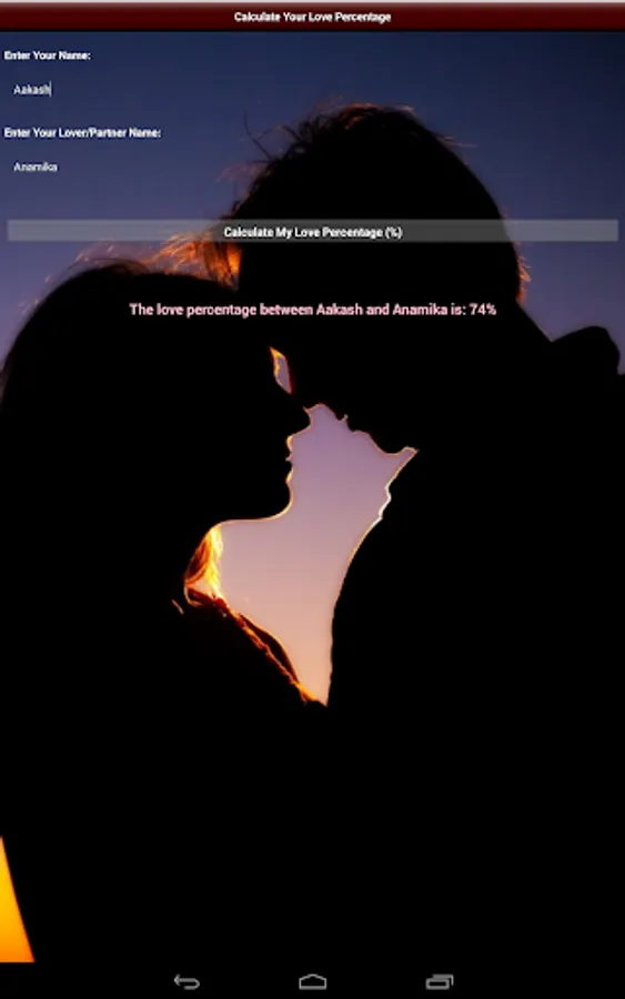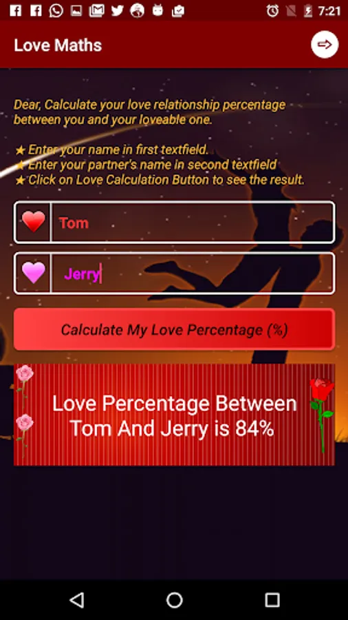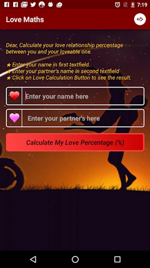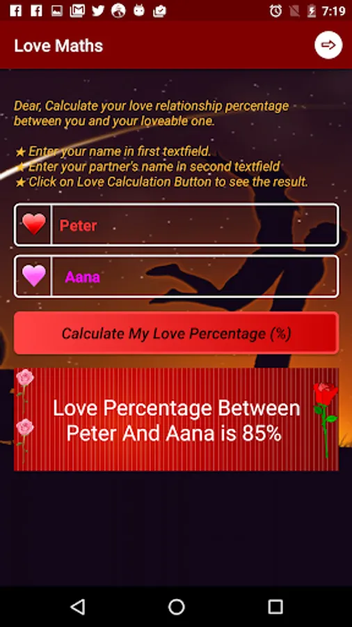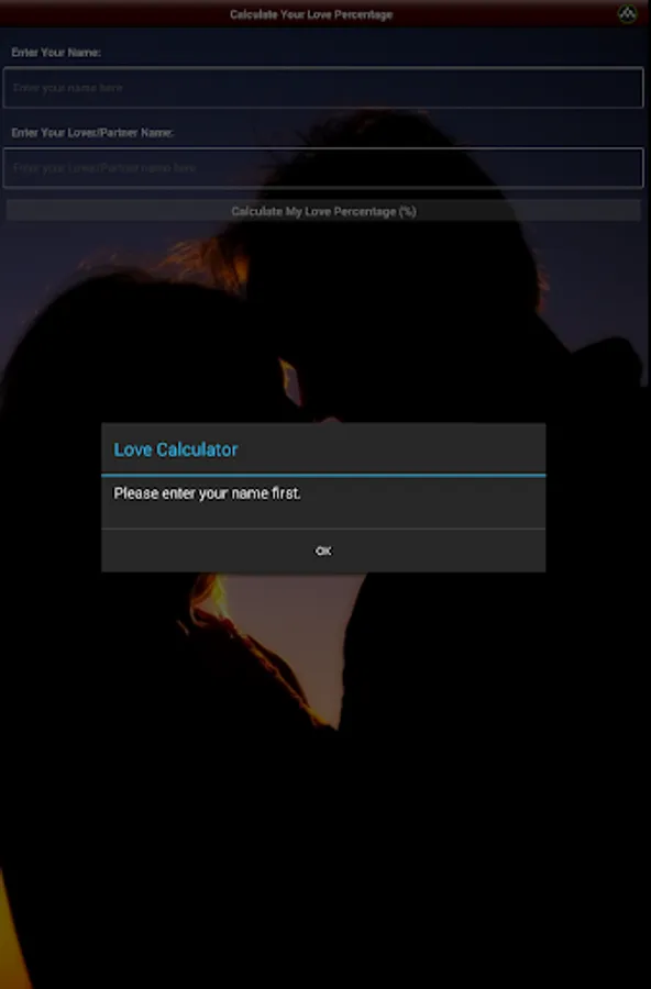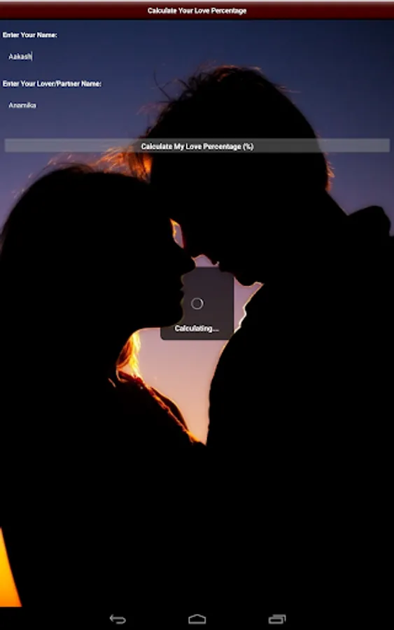 Love Calc/Calculator, an app is for calculating love percentage between you and your dear lovable partner.